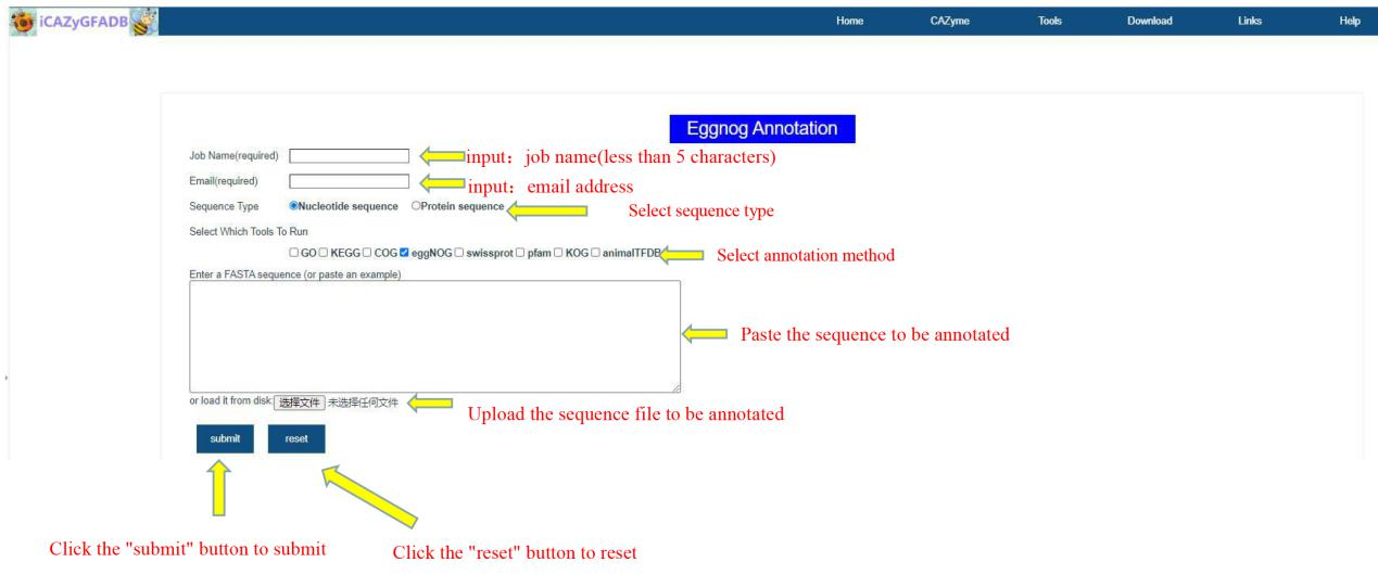 The first step is to input the job name (less than 5 characters) and email address. The second step is to select the sequence type(Nucleotide sequence OR Protein sequence) and annotation method. The third step is to upload the FASTA file of the annotation sequence. The fourth step is to submit.